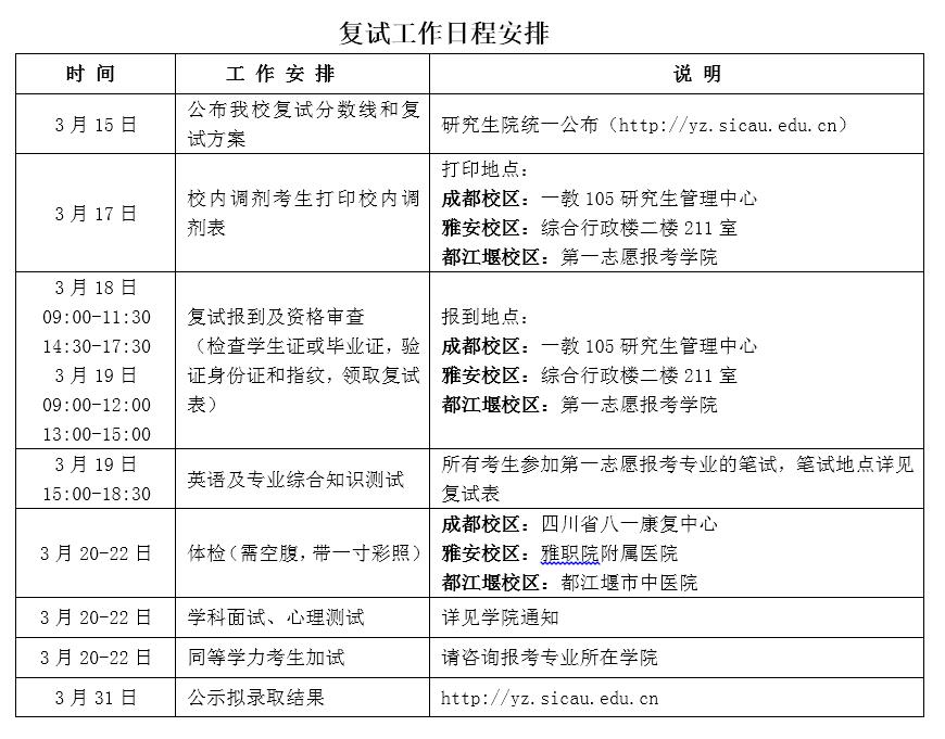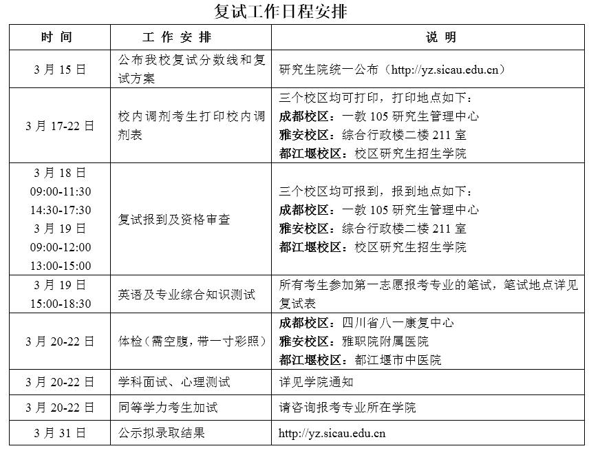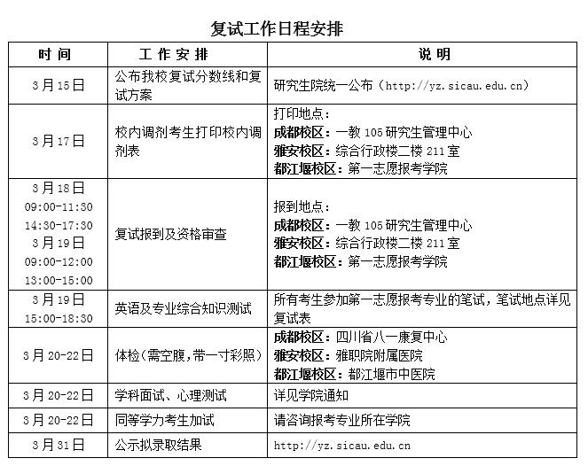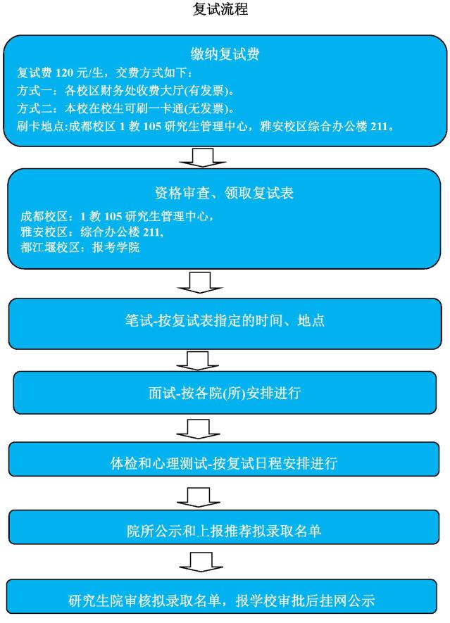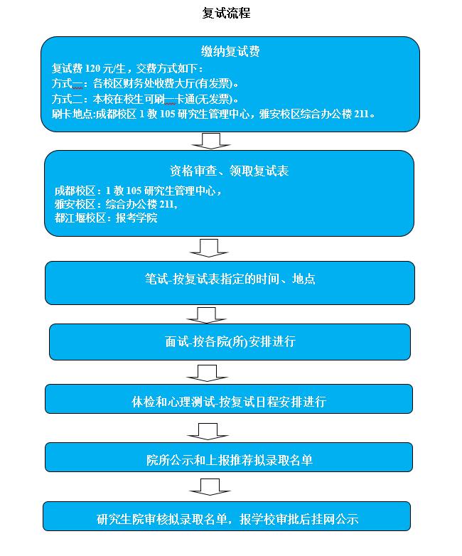 1.笔试:英语听力(100分,30分钟,全校统一命题)、专业英语测试(100分, 60分钟,按学科专业命题)和专业综合知识测试(100分,120分钟,按学科专业命题)。雅安校区和成都校区由学校统一组织,同堂考试,都江堰校区由各招生学院按要求进行复试。