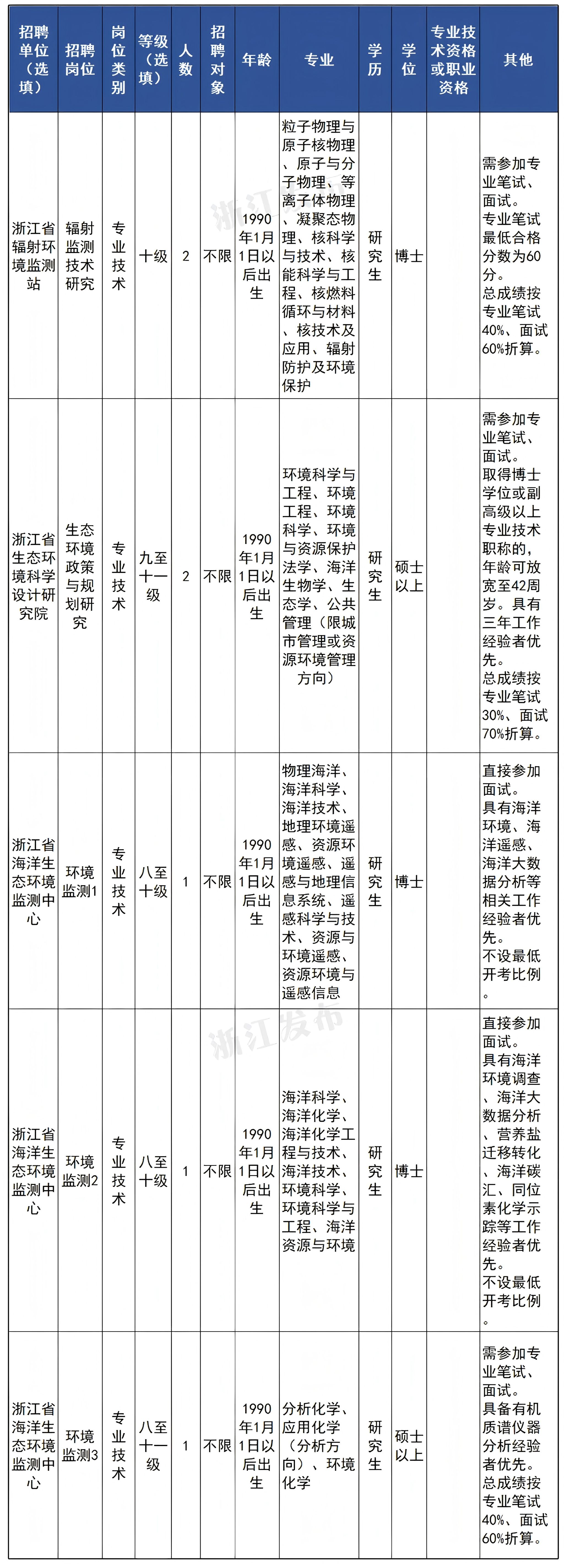 此次招聘的浙江省生态环境厅直属事业单位共3家。