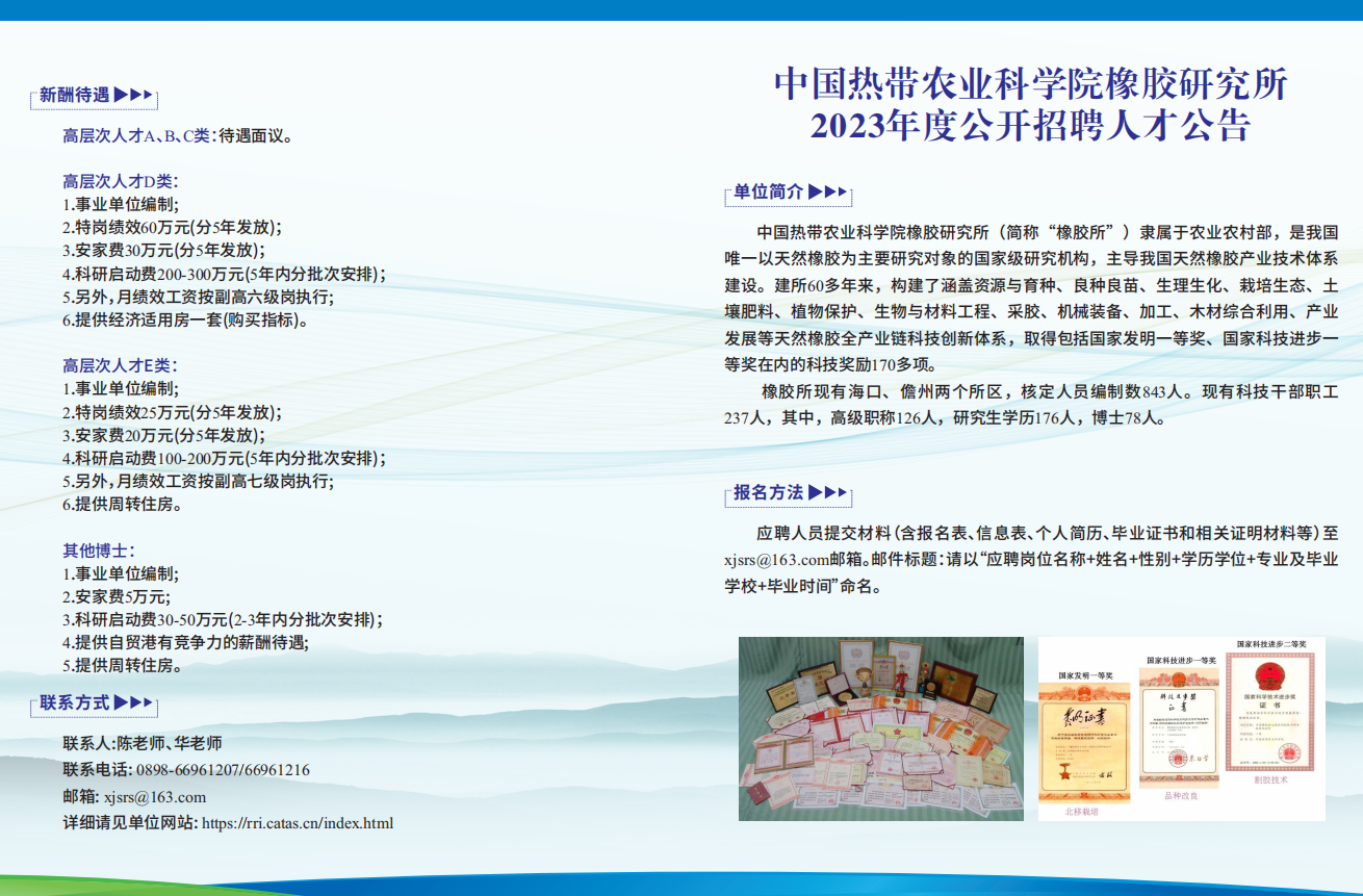 就业信息:中国热带农业科学院橡胶研究所2023年度公开招聘人才公告