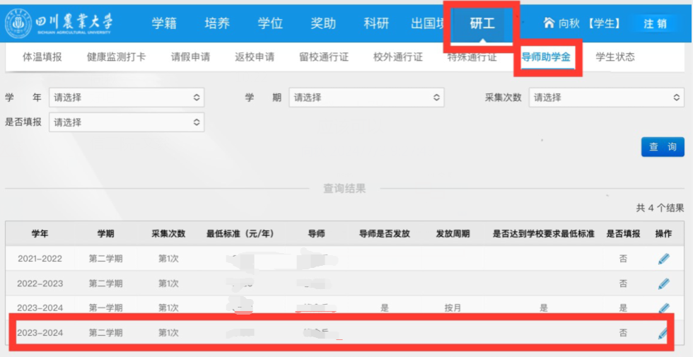 在读研究生均可在系统开放期间登录研究生管理系统-研工-导师助学金模块进行导师奖(助)学金发放信息的采集登记,务必保证反馈信息的真实性和准确性。