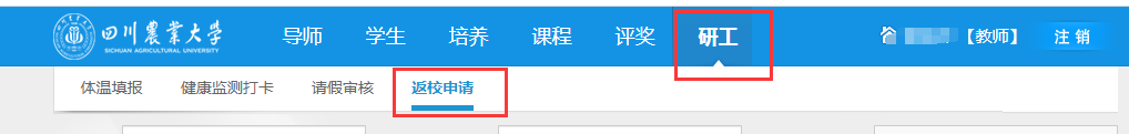 因多系统功能整合需要,研究生管理系统新增“研工”模块,包括“体温填报”、“健康监测”、“请假申请/审核”、“返校申请/审核”四项管理功能。因此,“返校申请/审核”已变动至“研工”模块。