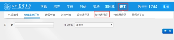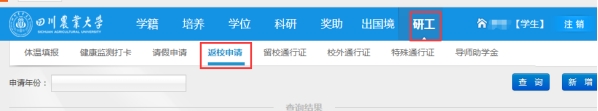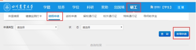 一、校内住宿的研究生,可点击“请假申请”新增申请,提交经导师审核通过后在申请离校当天可生成“研究生校园通行证”。请假者应在申请返校时间内返校并及时点击“确认返校”。