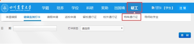 二、校内住宿的,因新老校区间或校区与基地间通勤等客观原因需频繁出入校门的研究生,可向培养单位申请开通“研究生特殊通行证”。开通后,申请者点击“特殊通行证”即可生成“研究生特殊通行证”。